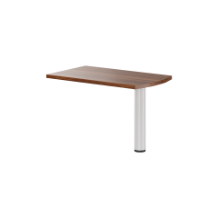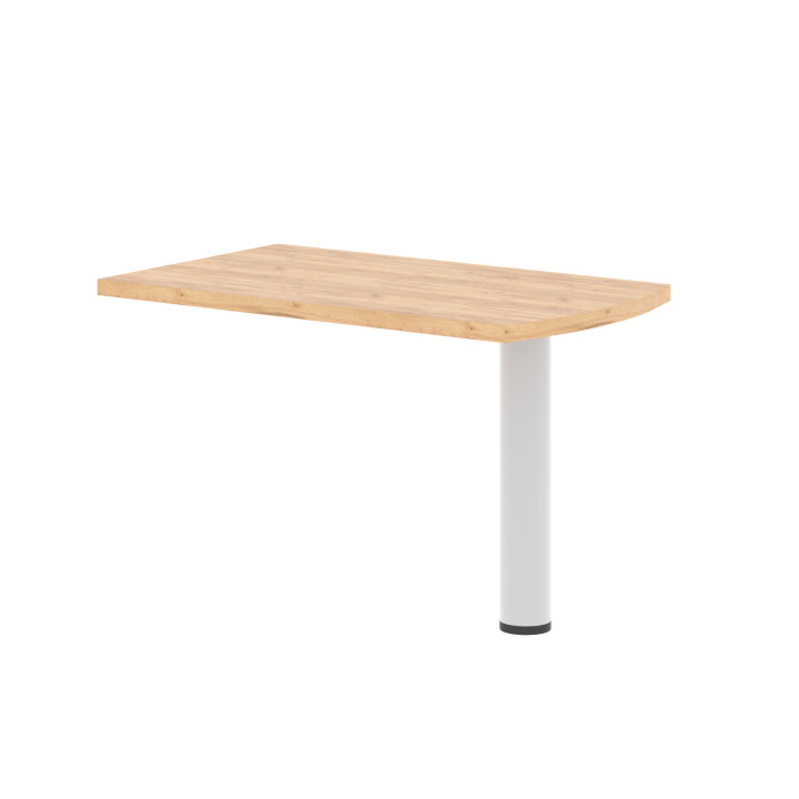 Приставка на опоре имеет столешницу прямоугольной формы с одной закругленной стороной. Это классическая конфигурация, используемая для увеличения площади столов. Металлическая опора надежно удерживает всю конструкцию. Такой мебельный предмет позволяет более практично и функционально использовать офисную мебель.