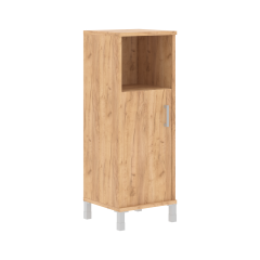 Стеллаж с дверью ДСП стоит на устойчивых крепких опорах, имеет открытую полку и закрытую часть. Модель эстетично смотрится в интерьере и радует глаз своим импозантным видом. В шкафу можно хранить самые разные вещи – документы, канцелярские принадлежности, сувенирную продукцию. Все, что нужно спрятать, удобно держать за глухой дверцей.