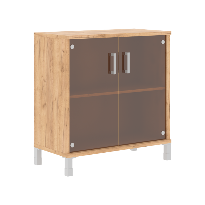 Каркасы шкафов выполнены из ЛДСП толщиной 25мм., кромка ПВХ т. 2мм. Задняя стенка из ХДФ т.4мм разрезная в паз. Внутренние полки из ЛДСП 18мм., кромка ПВХ т.0,8 мм. Горизонтальные панели из ЛДСП т 25мм., кромка ПВХ т. 2 с фасадной стороны, кромка ПВХ т. 0,8 с трех сторон. В упаковке один горизонтальный щит, который можно устанавливать вверху или внизу изделия. Опора регулируемая, цвет алюминий. Стекло -тонированное в массе, бронза. Ручка скоба, цвет алюминий. Двери вкладные.