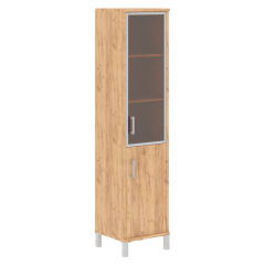 Каркасы шкафов выполнены из ЛДСП толщиной 25мм., кромка ПВХ т. 2мм. Задняя стенка из ХДФ т.4мм разрезная в паз. Внутренние полки из ЛДСП 18мм., кромка ПВХ т.0,8 мм. ЛДСП т 25мм., кромка ПВХ т. 2 с фасадной стороны, кромка ПВХ т. 0,8 с трех сторон. В упаковке один горизонтальный щит, который можно устанавливать вверху или внизу изделия. Опора регулируемая, цвет алюминий. Стеклянная дверь в алюминиевой рамке, стекло - тонированное пленкой, бронза. Ручка скоба, цвет алюминий. Двери вкладные.