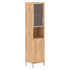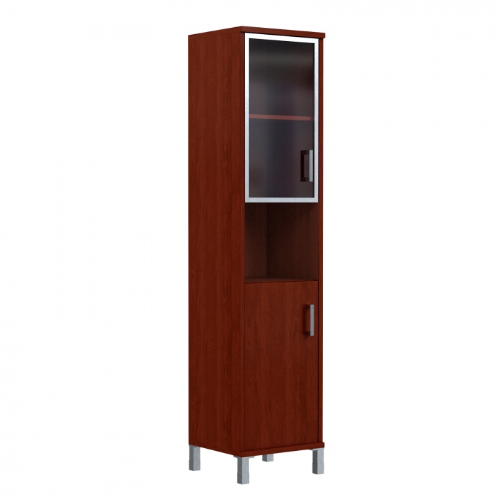 Каркасы шкафов выполнены из ЛДСП толщиной 25мм., кромка ПВХ т. 2мм. Задняя стенка из ХДФ т.4мм разрезная в паз. Внутренние полки из ЛДСП 18мм., кромка ПВХ т.0,8 мм. ЛДСП т 25мм., кромка ПВХ т. 2 с фасадной стороны, кромка ПВХ т. 0,8 с трех сторон. В упаковке один горизонтальный щит, который можно устанавливать вверху или внизу изделия. Опора регулируемая, цвет алюминий. Стеклянная дверь в алюминиевой рамке, стекло - тонированное пленкой, бронза. Ручка скоба, цвет алюминий. Двери вкладные.